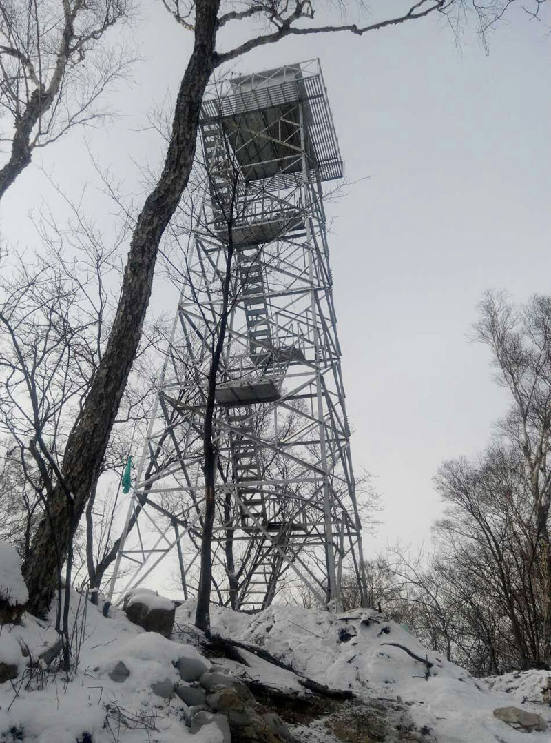監控塔結構一般為鋼結構塔架,拆、裝方便。平面為四邊形自立式或拉線式。主體曲線一般為折線型,內部結構為交叉式。上部設工作平臺或值勤房。內部設有斜向爬梯或旋轉爬梯。